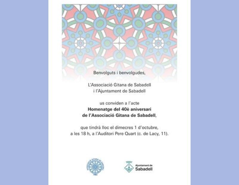El próximo miércoles 1 de octubre, a las 18 h, tendrá lugar en el Auditorio Pere Quart de Sabadell el acto central de celebración del 40º aniversario de la Asociación Gitana de Sabadell y Comarca, una entidad pionera en el movimiento asociativo gitano tanto en Cataluña como en el conjunto del Estado español.
