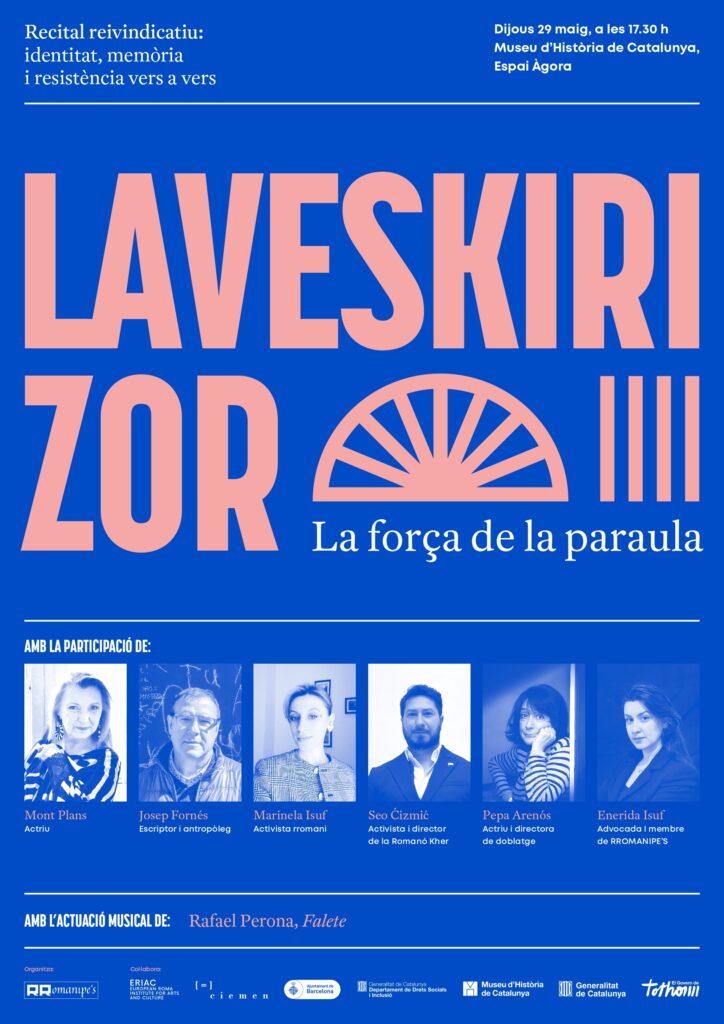 La Asociación Rromanipe’s, situada en Barcelona, anuncia que el recital poético “Laveskiri Zor” tendrá lugar el próximo 29 de mayo a las 17:30h en el Museo de Historia de Cataluña. A través de la poesía en rromanò y catalán, se dará voz a dos lenguas históricamente discriminadas, promoviendo un espacio de diálogo intercultural y de reconocimiento mutuo. En este encuentro participarán distintas personalidades como la actriz Mont Plans, el escritor y antropólogo Josep Fornés, la activista rromaní Marinela Isuf, el activista y director de la Romanó Kher, Seo Cizmich, la actriz y directora de doblaje Pepa Arenós, y la abogada Enerida Isuf, que además forma parte de Rromanipe’s.